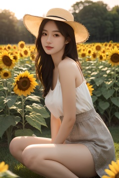 <lora:0813_02:0.7>,a girl with a sun hat, sitting in a field of sunflowers, bathed in the golden glow of sunset, warm hues, peaceful ambiance, natural beauty.korean girl,black hair,, 1girl,realistic,masterpiece, best quality, photorealistic, HDR,detail