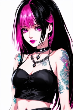 Goth girl, goth girl 1girl, 1girl,solo,looking at viewer, long hair,hair between the eyes,bare shoulders,jewelry,(black hair, pink hair,multicolored hair,glowing hair), tattoo, sleeveless,pink eyes,necklace,two-tone hair,lips,makeup,white background,portrait,spot colo
