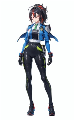 <lora:zhuyuan (20):0.8>,ZhuYuan CYQL,1girl,looking at viewer,solo,long hair,ponytail,ahoge,hair between eyes,black hair,red hair,multicolored hair,streaked hair,red eyes,bodysuit,breasts,full body,necktie,green necktie,jacket,shirt,gloves,black gloves,police uniform,uniform,pants,policewoman,green background,simple background,posing,masterpiece,best quality,beautiful and aesthetic,