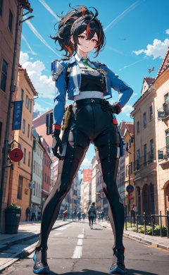 <lora:zhuyuan (20):0.8>,ZhuYuan CYQL,1girl,looking at viewer,solo,long hair,ponytail,ahoge,hair between eyes,black hair,red hair,multicolored hair,streaked hair,red eyes,bodysuit,breasts,full body,necktie,green necktie,jacket,shirt,gloves,black gloves,police uniform,uniform,pants,policewoman,:d,upper_body,Prague, Sightseeing tour, Morning light, Architecture, History,(Orchids, Ferns, Palm trees, Epiphytes, Dense foliage, Humidity, Exotic birds:0.5),beautiful detailed sky,beautiful detailed glow,posing in front of a colorful and dynamic background,masterpiece,best quality,beautiful and aesthetic,contrapposto,female focus,wallpaper,
