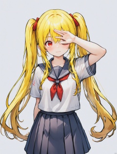 可爱的黄头发,红眼睛双马尾女孩,用手遮住一只眼睛,头发遮住手,睁开眼睛,飘逸的长发