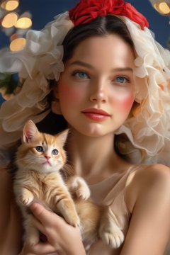 cinematic upper body photo a woman holding a kitten in her hands, ((best best quality)), ((masterpiece)), ((realistic)), (detailed), blush, (masterpiece), absurdres, HDR , . 35mm photograph, film, bokeh, professional, 4k, highly detailed, detailed skin texture, (goosebumps:0.5), subsurface scattering, pure skin, skin pores, blue eyes