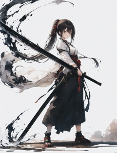 二次元动漫风格,一个古风女子,手持一把黑色的长剑,剑锋画过的地方留下如墨水和烟雾的轨迹