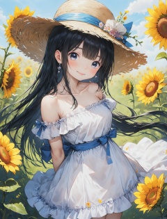 二次元动漫风格,一个黑色长直发的有闪亮大眼睛女孩,穿着露肩褶边白色连衣裙,丝带,蝴蝶结,带着配有花饰品的草帽,露出狡黠的微笑,微倾着身体,四十五度侧面视角。场景在向日葵花田,阳光明媚