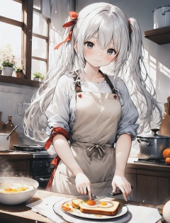 二次元动漫风格,银白色长发的女孩带着围裙,穿着居家服,正在做早餐三明治,画面充满了温馨的生活气息