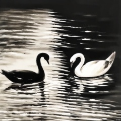 ink painting, a painting of two ducks swimming in a lake with a dark sky in the background and a white swan in the foreground, monochrome, greyscale, water, no humans, bird, animal, animal focus, reflection, spot color, snake