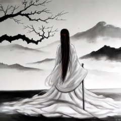 ink painting, a woman in a white dress sitting on a hill with a tree in the background and a mountain in the distance, 1girl, solo, long hair, black hair, very long hair, monochrome, from behind, tree, letterboxed, spot color, mountain, branch, bare tree, fog, red eyes, holding, weapon, japanese clothes, sword, glowing