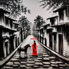 ink painting, a painting of a woman in a red dress holding an umbrella on a street with buildings and a horse, 1girl, solo, japanese clothes, kimono, tree, umbrella, letterboxed, scenery, lantern, stairs, oil-paper umbrella, torii, shrine, 1boy, spot color, architecture, east asian architecture