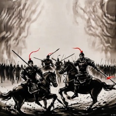 ink painting, a painting of a group of men on horses with spears in their hands and a red arrow in their hand, holding, monochrome, weapon, male focus, multiple boys, sword, holding weapon, armor, katana, helmet, polearm, spot color, 6+boys, spear, riding, japanese armor, holding polearm, horse, horseback riding, kusazuri, kabuto \(helmet\), letterboxed, shoulder armor, bow \(weapon\), fighting stance, arrow \(projectile\), ninja, battle, samurai