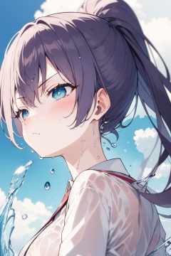 1girl,Suo Yuki,Side close-up,portrait,long hair,bangs,ponytail,sweatdrop,constricted pupils,((disgust)),beautiful_detailed_eyes,the best details,<lora:lbc_Suo_Yuki_v1.0-000008:0.9>,BREAK((water drops)),wet clothes,((beautiful detailed water)),((floating)),dynamic angle,