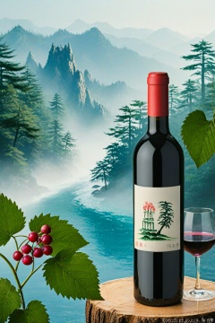 Show a bottle of wine, white goblet, a little wine in the background, forest scenery, a long river, miniature photography, flowers and plants landscape, mountain mist, jungle, Chinese landscape painting, mountain waterfalls,