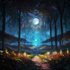 style by Yuumei,best quality,high resolution,8k aesthetic,mesmerise celestial moonlight,floral atmosphere,vibrant light-trail effect on a realistic,hyperdetailed glowing floral,luminous foliage,dreamlike oasis-garden naughty daemon inspired by Jarek Kubicki huge busy detailed scene,,noc-landscape