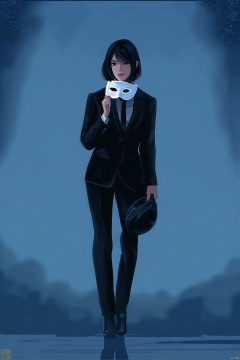 1girl, in black suit holding a mask,short hair,halftone background,blue mystery theme