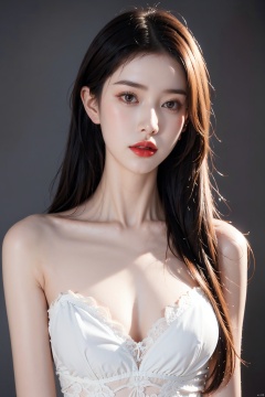 1girl,solo,looking at viewer,long hair,lipstick,red lips,lips,makeup,white_skin,slender,straight_hair,collarbonea,medium breasts,lace,huge filesize,(Cinematic Lighting:0.6),skinny,sleeveless,stylish_pose,close-up,taut_clothes,microdress,strapless,portrait,