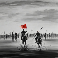 水墨画,一群骑马的人和一只狗追赶一个举着红旗的马上的人的画,持有,武器,多个男孩,斗篷,持有武器,盔甲,长棍,长矛,骑马,持有长棍,多个其他,马,士兵,骑马,户外,天空,剑,云,头盔,信箱,旗帜,灰色的天空,军队