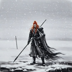 水墨画,一个男人拿着枪站在雪地里,独奏,长发,1男孩,拿着,站立,单色,武器,男性焦点,红发,剑,斗篷,拿着武器,盔甲,信箱,长棍,雪,斑点色,长矛,长袍,下雪,拿着长棍