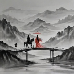 水墨画,一个人骑马穿过山脉上的桥梁,一个人骑马,1女孩,长发,多个女孩,抱着,站立,户外,日本服装,和服,水,伞,信箱,风景,山,油纸伞,桥,雾,1男孩,武器,剑,灰色的天空