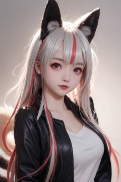 1girl,animal_ears,red_eyes,solo,v,tail,smile,multicolored_hair,red_hair,hair_ornament,jacket,fox_ears,looking_at_viewer,two-tone_background,black_jacket,(streaked_hair:1.4),animal_ear_fluff,fox_girl,blush,fox_tail,x_hair_ornament,upper_body,short_hair,white_shirt,hairclip,shirt,