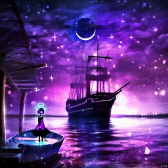 s-style, 剪影画, 空灵的氛围, 1 girl, 紫色主题, 独奏, 短发, 连衣裙, 站立, 户外, 天空, 云, 水, 夜, 光环, 月亮, 星(天空), 夜空, 风景, 星空, 月牙, 建筑, 倒影, 城市, 幻想, 城市灯光, 水体的宁静夜色。, 天空被涂成紫色和蓝色的色调和新月。水面反射着天空的颜色和船上的灯光, 左侧水边站着一个紫黑相间的女孩的剪影, 凝视着船。, 她穿着连衣裙, 戴着发光的头饰, 船被灯光照亮, 一艘有多个甲板的大船, 整个场景沐浴在神奇的氛围中, 空气中漂浮着火花和颗粒, 水体, 船, 女孩, 头饰, 甲板, 神奇的氛围, 火花, 颗粒