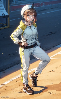 <lora:Ryza-000002:0.8>,Ryza CYQL,1girl,looking at viewer,solo,brown hair,short hair,hair ornament,hairclip,white headwear,hat,brown eyes,jewelry,necklace,star necklace,((Athleisure_tracksuit:1.5),(Sneakers_with_colorful_soles:1.4),(Baseball_cap:1.3),(Urban_market_background:1.4):1.3),(cowboy_shot,from_above,spread legs:1.2),hand on hip,Yoga class in city park, Exercise, Relaxation, Wellness, Community,Night-blooming lilies,beautiful detailed sky,beautiful detailed glow,(English text:1.3),(border:1.5),posing in front of a colorful and dynamic background,(masterpiece, best quality, beautiful and aesthetic:1.3),contrapposto,female focus,fine fabric emphasis,wallpaper,fashion,Lipstick,depth of field,intricate_detail,finely_detailed,fine_fabric_emphasis,(glossy),<lora:增强减少细节add_detail:0.4>,