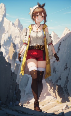 <lora:Ryza-000002:0.8>,Ryza CYQL,1girl,looking at viewer,solo,brown hair,short hair,hair ornament,hairclip,white headwear,hat,brown eyes,jewelry,necklace,star necklace,yellow jacket,breasts,smile,gloves,collarbone,jacket,shorts,red shorts,belt,short shorts,sleeveless jacket,single glove,shirt,thighhighs,cleavage,thighs,white shirt,beret,detached sleeves,boots,full body,(yandere:1.3),(full_shot:1.2),(from_back:1.1),Grapevines, Harvested grapes, Vineyard rows, Wooden barrels, Harvest festival, Golden hour,beautiful detailed sky,beautiful detailed glow,posing in front of a colorful and dynamic background,masterpiece,best quality,beautiful and aesthetic,contrapposto,female focus,wallpaper,