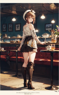 <lora:Ryza-000002:0.8>,Ryza CYQL,1girl,looking at viewer,solo,brown hair,short hair,hair ornament,hairclip,white headwear,hat,brown eyes,jewelry,necklace,star necklace,((Turtleneck_sweater:1.4),(Leather_skirt:1.3),(Over-the-knee_boots:1.2),(Cafe_interior_background:1.4):1.3),(panorama,from_back,on stomach:1.2),hand between legs,Lake, Wildflowers, Mountains, Reflection, Colors, Serenity, Tranquility,wisteria,hibiscus,beautiful detailed sky,beautiful detailed glow,(English text:1.3),(border:1.5),posing in front of a colorful and dynamic background,(masterpiece, best quality, beautiful and aesthetic:1.3),contrapposto,female focus,fine fabric emphasis,wallpaper,fashion,Lipstick,depth of field,intricate_detail,finely_detailed,fine_fabric_emphasis,(glossy),<lora:增强减少细节add_detail:0.4>,