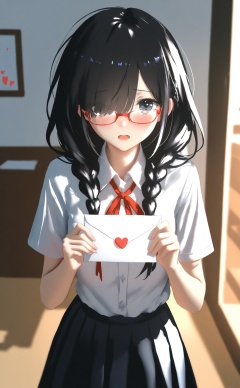 masterpiece),(best quality),illustration,ultra detailed,hdr,Depth of field,(colorful),Artist wlop,Artist\:aki99,Artist miwano rag,1girl,nosebleed,blood,love letter,solo,glasses,shirt,black hair,braid,long hair,skirt,white shirt,ribbon,looking at viewer,blush,red ribbon,holding,open mouth,neck ribbon,black skirt,red-framed eyewear,heart,short sleeves,school uniform,collared shirt,grey eyes,indoors,letter,twin braids,envelope,pleated skirt,dress shirt,hair over one eye,