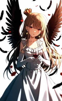 masterpiece),(best quality),illustration,ultra detailed,hdr,Depth of field,(colorful),Artist amane utata,1girl,wings,solo,elbow gloves,blood,gloves,dress,long hair,red eyes,feathered wings,black wings,crown,white dress,white gloves,bug,looking at viewer,feathers,earrings,jewelry,butterfly,breasts,sleeveless,very long hair,head tilt,sleeveless dress,cup,collarbone,holding,blood on clothes,skirt hold,drinking glass,wine glass,white background,frilled dress,bow,standing,parted lips,small breasts,holding cup,bare shoulders,frills,mini crown,
