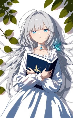 masterpiece,best quality,high quality,(colorful),nai3 Style,loli,1girl,solo,holding,book,long hair,white choker,holding book,mole under eye,choker,ahoge,mole,parted lips,white dress,blue eyes,hair intakes,upper body,jewelry,looking at viewer,leaf,frills,dress,white hair,long sleeves,hugging object,lying,grey hair,huge ahoge,bug,collarbone,on back,plant,ring,