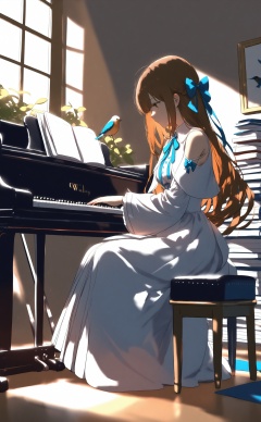 masterpiece,best quality,high quality,(colorful),nai3 Style,loli,1girl,instrument,piano,window,sitting,solo,white dress,shoulder cutout,long hair,book,indoors,dress,playing instrument,music,brown hair,long sleeves,ribbon,book stack,breasts,neck ribbon,brown eyes,hair bow,bow,light particles,profile,clothing cutout,sunlight,white capelet,bare shoulders,from side,looking down,white ribbon,wide sleeves,medium breasts,cross-laced clothes,blue ribbon,white bow,bird,sidelocks,envelope,cage,window shade,parted lips,