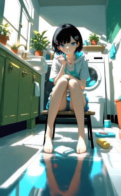 masterpiece,best quality,high quality,(colorful),nai3 Style,loli,1girl,brushing teeth,toothbrush,black hair,barefoot,shorts,solo,holding,cup,white hoodie,indoors,blue shorts,sitting,mirror,plant,potted plant,faucet,hoodie,short hair,bathroom,hair ornament,hood,tiles,sink,holding cup,hairclip,toes,towel,washing machine,stool,tile floor,knees together feet apart,feet,reflection,short shorts,chair,bare legs,short sleeves,holding toothbrush,full body,hood down,legs,toenails,window,blue eyes,mug,drawstring,day,cabinet,sunlight,reflective floor,knees up,
