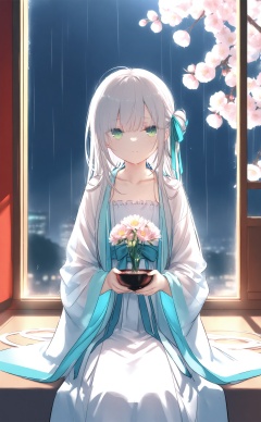 masterpiece,best quality,high quality,(colorful),nai3 Style,loli,[Artist toosaka asagi],[[[Artist wlop]]],[Artist chen bin],[Artist omone hokoma agm],Artist hiten (hitenkei),loli,Artist:CyanAutumn,hanfu,1girl,solo,green eyes,chinese clothes,rain,flower,window,night,wide sleeves,ribbon,long sleeves,grey hair,long hair,hair ribbon,indoors,branch,collarbone,looking up,holding,sitting,closed mouth,