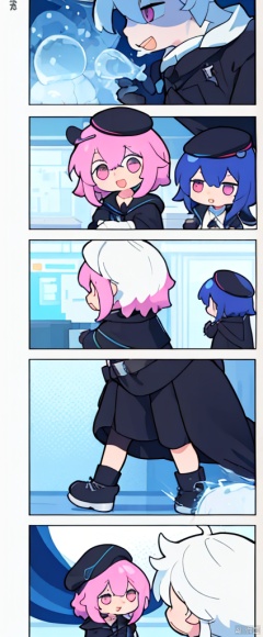 1 girl, omedoll,multicolored clothes, multiple views, comic,chibi,(multicolored hair:1.2),solo, looking at viewer, smile, open mouth, bangs, shirt, red eyes, gloves, 1boy, hat, ribbon, hair between eyes, sitting, blue hair, full body, :d, male focus, pantyhose, sidelocks, shoes, shorts, black gloves, elbow gloves, belt, white gloves, hand up, hood, pink eyes, black footwear, neckerchief, head tilt, black pantyhose, black shirt, clothing cutout, black ribbon, beret, umbrella, black shorts, otoko no ko, sneakers, cloak, tentacles, short hair with long locks, androgynous, blue headwear, black belt, legwear under shorts, blue neckerchief, infection monitor \(arknights\), jellyfish, white cloak, blue cloak
