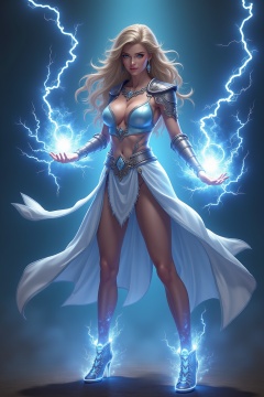 a beautiful girl standing. She uses the magic ring and turns into a beautiful lightning magic \(ek_ge1tng\) warrior \(detailed exquisite face\),ek_game_3ffect,dynamic sexy pose,lightning elemental effects,lightning weapon