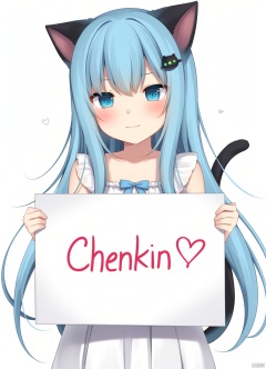 amashiro natsuki sytle, nekoha shizuku \(amashiro natsuki\), 1girl, animal ears, cat ears, blue_hair,blue_eyes,long_hair,dress,smile, Holding up a sign that says, "❤Chenkin❤" heart,black cat ears,