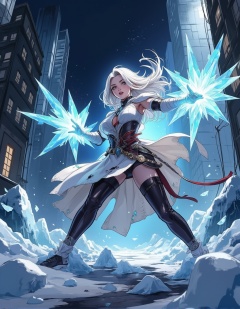 a beautiful ice sorceress \(ek_ge1tng\) attacking enemy with ice blasts,detailed exquisite face,ek_game_3ffect,dynamic pose,ice elemental effects forming sharp ice pillars towards enemy,dark city street,puddles,mint white and red clothes,ek_art_b00ster,ink style