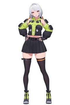8k, best quality, masterpiece, (ultra-detailed), (high detailed skin), (full body:1.25), (white background:1.4), (simple background), standing, looking at viewer, (solo:1.2), hands on hips, <lora:anbi-sd-Tanger:1>, anbi, default clothes, 1girl, black fingerless gloves, black thighhighs, orange eyes, black pleated skirt,
