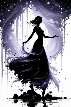 1girl, silhouette, ink bubbles in background, she dances in a sea of inky stars, looking at viewer, ink rain, stunning image, ink smoke, digital art, professional style, loiking at viewer, upper body, anime likes silhouette, ((masterpiece quality: 2)), ink droplets, attractive image. Ink art style.