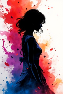 1girl, silhouette, ((ink brushstrokes in background: 2)), colorful ink brushstrokes behind, looking at viewer, upper body, dynamic brushstrokes, masterpiece quality, stunning image, anime aesthetics, INK