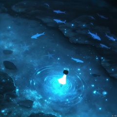 s-style, 剪影画, 空灵的氛围, 蓝色主题, 1girl, 独奏, 短发, 黑发, 连衣裙, 站立, 户外, 水, 夜, 光环, 明星(天空), 风景, 涉水, 黑暗, 涟漪, 天空, 光粒子, 星空, 反射, 一个迷人的水下场景, 由明亮的蓝色光芒照亮。, 一个女孩的剪影站在水面上, 激起涟漪。, (水下有发光的生物), (发出蓝光), 照亮了小女孩的轮廓, 照亮了鲨鱼的轮廓, 鱼和其他水生生物的轮廓在光环周围游泳