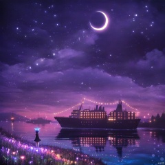 s-style, 剪影画, 空灵的氛围, 1 girl, 紫色主题, 独奏, 短发, 连衣裙, 站立, 户外, 天空, 云, 水, 夜, 光环, 月亮, 星(天空), 夜空, 风景, 星空, 月牙, 建筑, 倒影, 城市, 幻想, 城市灯光, 水体的宁静夜色。, 天空被涂成紫色和蓝色的色调和新月。水面反射着天空的颜色和船上的灯光, 左侧水边站着一个紫黑相间的女孩的剪影, 凝视着船。, 她穿着连衣裙, 戴着发光的头饰, 船被灯光照亮, 一艘有多个甲板的大船, 整个场景沐浴在神奇的氛围中, 空气中漂浮着火花和颗粒, 水体, 船, 女孩, 头饰, 甲板, 神奇的氛围, 火花, 颗粒