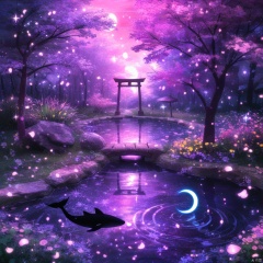 s-style, 剪影画, 空灵的氛围, 1 girl, 紫色主题, 独奏, 水, 风景, 反射, 涟漪, 模糊, 花瓣, 没有人, 窗户, 夜晚, 月亮, 一个充满活力和空灵的场景, 以紫色, 粉色和蓝色色调为主, 池塘或水体的奇幻表现, 周围漂浮和旋转, 有彩色的海洋生物轮廓, 黑色的鲸鱼轮廓, 水面被发光的球体, 星星和其他天体元素反射, 右下角可见鸟居和新月, 一种神奇的梦幻的氛围。