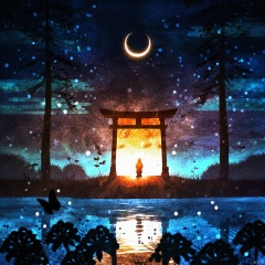s-style, 剪影画, 空灵的氛围, 1 girl, 独奏, 蓝色和橙色主题, 站立, 日本服装, 天空, 水, 树, 夜, 月亮, 虫子, 风景, 剪影, 鸟居, 月牙, 星星(天空), 一个人的黑色剪影, 自然, 星空, 宁静而神秘的夜晚, 一个人的黑橙色轮廓站在华丽的巨大鸟居门前, 门从内部照亮, 投射出温暖的金色光芒, 该人的轮廓穿着传统服装, 可能是和服, 背景充满了令人着迷的色彩混合体, 主要是代表夜空的蓝色和紫色。, 星星星点点, 中央可见月牙, 下方的海水倒映天空的颜色, 右侧有蝴蝶的剪影, 安详, 神秘, 夜色, 鸟居门, 金光, 传统服饰, 星星, 蝴蝶
