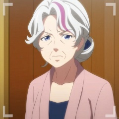 solo, looking at viewer, blue eyes,  upper body, white hair, female focus, multicolored hair, indoors, frown, parody, robe, old, old woman