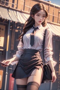 8K image., shinkai color,1girl, solo, long hair, skirt, shirt, thighhighs, holding, school uniform, purple eyes, white shirt, black hair, necktie, black thighhighs, bag, zettai ryouiki, phone, cellphone, smartphone, holding phone