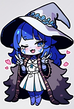 1girl,  blue eyes, blue skin, blue hair, extra faces, extra arms, doll joints, cracked skin, one eye closed, grey fur cloak, white dress, blue ring, white witch hat, chibi, smile, looking at viewer, v, simple background, double v, white background, full body, open mouth, cartoon, blue color scheme, magical, cute, anime style, tears, pink heart, dress, wolf, colored skin, fur cloak, cloak, blush, hat, witch hat, heart, animal, joints, masterpiece, best quality, newest, absurdres, safe <lora:ln_v1.1-000012:1>