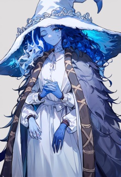 1girl, ranni the witch,  ciloranko, maccha \(mochancc\), lobelia \(saclia\), migolu, ask \(askzy\), wanke, (jiu ye sang:1.1), (rumoon:0.9), (mizumi zumi:1.1), white witch hat, blue ring, white dress, grey fur cloak, blue hair, blue eyes, one eye closed, blue skin, cracked skin, doll joints, extra arms, extra faces, hat, solo, looking at viewer, crack, closed mouth, doll, witch hat, joints, cloak, dress, long hair, colored skin, masterpiece, best quality, newest, absurdres, nsfw, explicit <lora:ln_v1.1-000013:1>