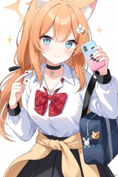 1girl, solo, long hair, looking at viewer, blush, smile, bangs, skirt, simple background, shirt, hair ornament, white background, bow, holding, animal ears, closed mouth, school uniform, green eyes, collarbone, white shirt, flower, cowboy shot, pleated skirt, alternate costume, choker, collared shirt, hair flower, bowtie, black skirt, bag, nail polish, orange hair, animal ear fluff, sparkle, v, black choker, halo, phone, scrunchie, cellphone, cross, black nails, smartphone, holding phone, school bag, wrist scrunchie, clothes around waist, sweater around waist, mari \(blue archive\)