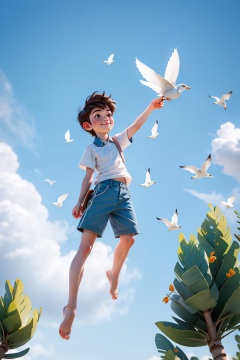 1girl, solo, smile, short hair, brown hair, shirt, 1boy, white shirt, short sleeves, male focus, shorts, barefoot, collared shirt, arm up, bird, blue shorts, pencil, wide shot
