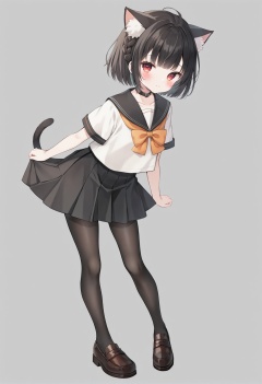 masterpiece, best quality,1girl, solo, animal ears, pantyhose, skirt, school uniform, black hair, full body, pleated skirt, cat ears, red eyes, simple background, white background, short hair, bow, looking at viewer, serafuku, black skirt, animal ear fluff, short sleeves, shoes, sailor collar, standing, black pantyhose, shirt, blush, choker, white shirt, virtual youtuber, closed mouth, black sailor collar, bowtie, braid, loafers, orange bow, brown footwear, black choker, jewelry, collarbone